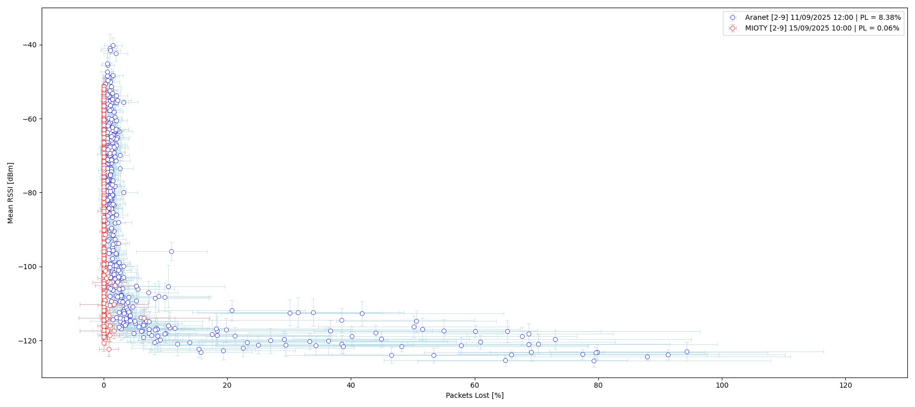 Projekta ietvaros ir ticis veikts divu radio protokolu – Aranet radio un mioty™ – darbības efektivitātes praktisks salīdzinājums. Lai šo mērķi sasniegtu, tika izvēlētas divas arhitektoniski praktiski identiskas RTU kopmītņu ēkas. Katrā no tām tika uzstādīti 464 bezvadu gaisa kvalitātes sensori un 8 datu uztveršanas bāzes stacijas. Taču vienā no ēkām tika izmantots Aranet radio protokols, bet otrā – komplicētākais mioty™ protokols. Tehnoloģiju kvantitatīvai salīdzināšanai tika izvēlēti divi parametri – uztvertā signāla stipruma indikators (RSSI) un datu pakešu zuduma procents. Reprezentatīvs šo divu parametru grafisks salīdzinājums visiem kopmītnēs uzstādītājiem sensoriem dots 1. attēlā.